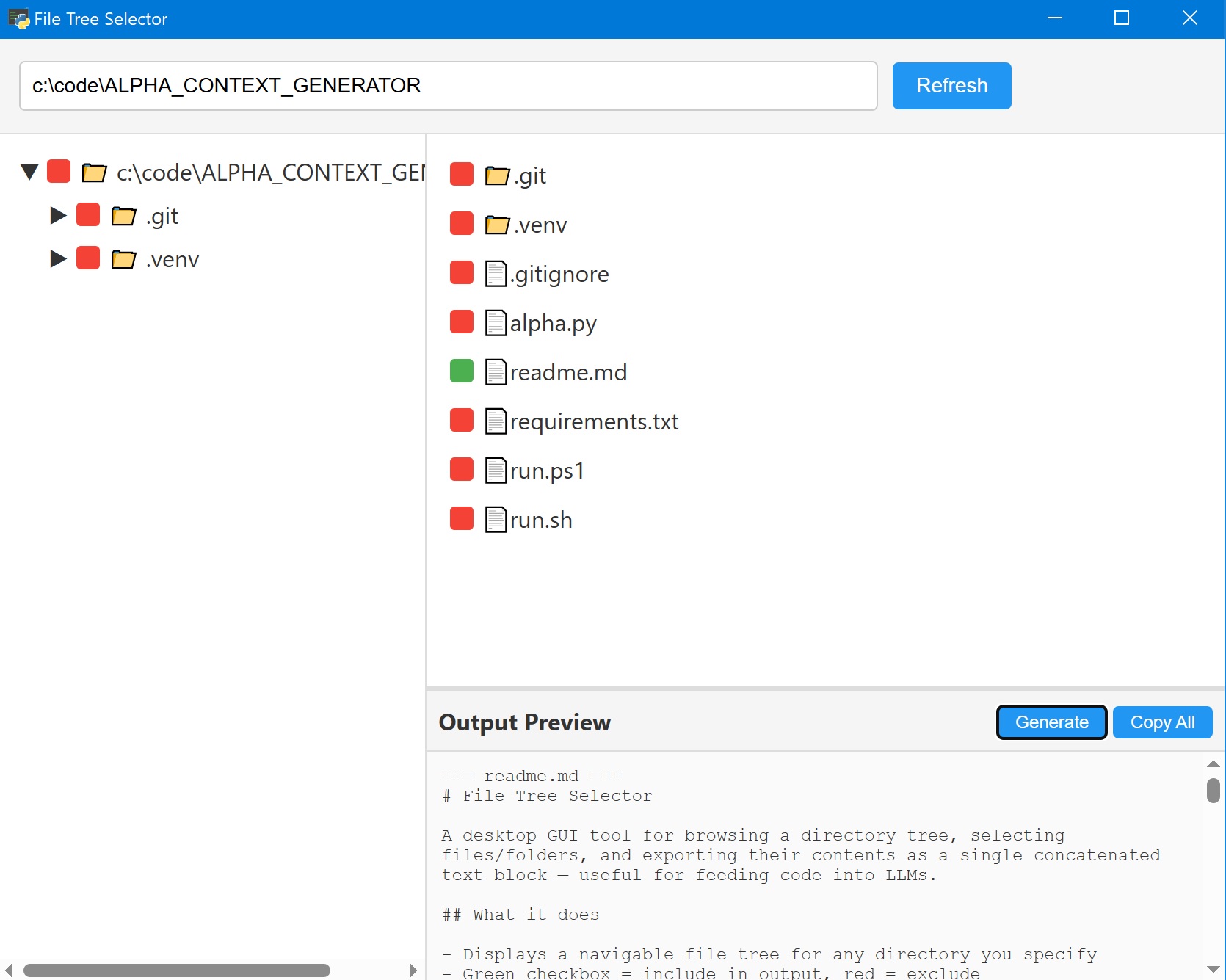 • "Generate" concatenates all selected files into a preview pane; "Copy All" puts it on your clipboard